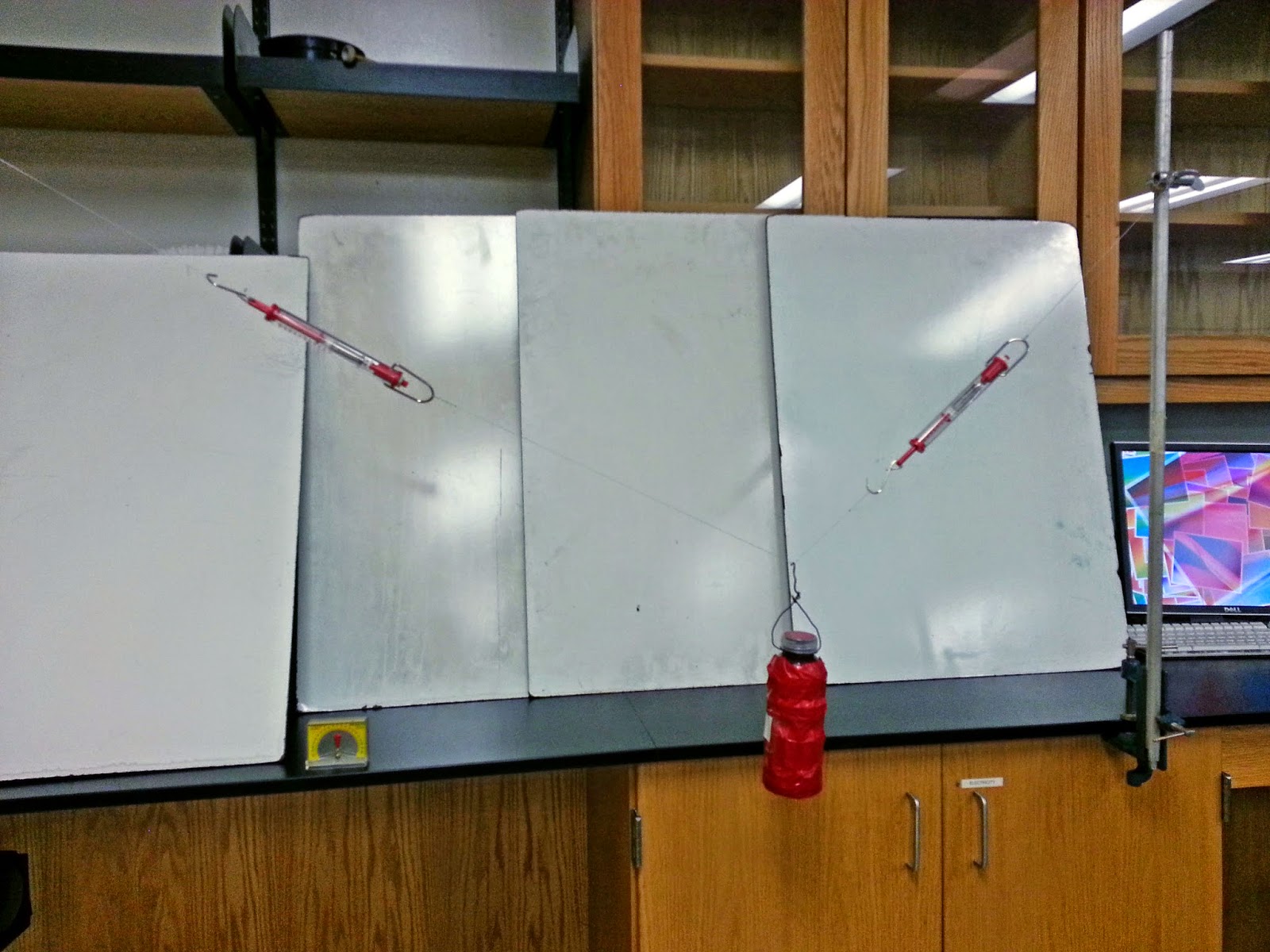 The top picture were going to call unknown mass 1 and the bottom unknown mass 2. From the spring scales we read the tension in the string. We also used a device that allowed us to find the degree of the string above the horizontal. The springs had an error of +/- 0.5 Newtons and the degree measuring device had an error of +/- 2° which is +/- 0.034906585 radians. Below is a picture of the device.